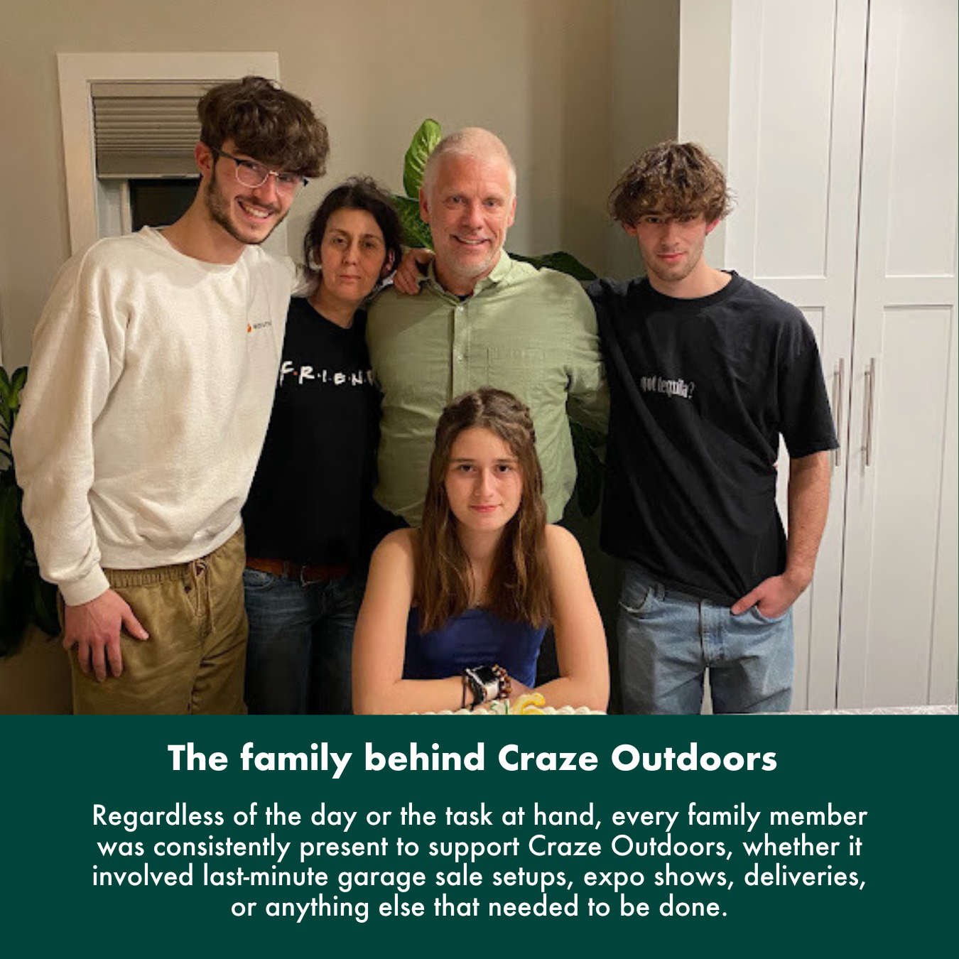 Craze Outdoors owes its existence to the unwavering support of family and friends. From humble beginnings in our home garage, to late-night packaging sessions, and even building our first store by hand – every step of the way, our loved ones stood by us. Today, as we expand beyond our wildest dreams of just 3 years ago, our family's support and dedication continues to be the cornerstone of our success.