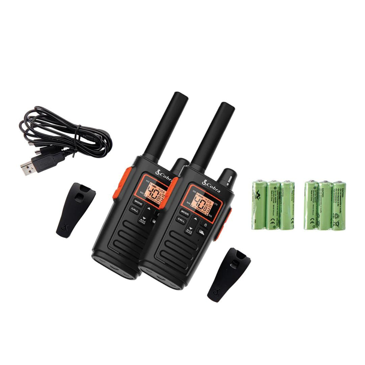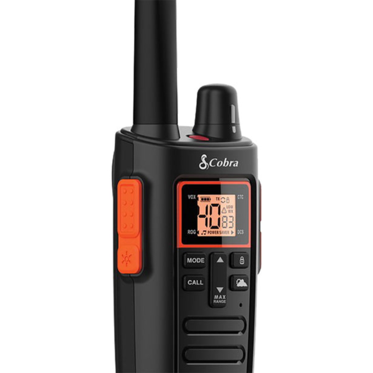The Cobra RX380 contains a pair of weather-resistant walkie talkies that are perfect for families and friends to use outdoors. With up to 32-mile range, 40 preset channels, NOAA Weather Alerts, built-in LED flashlight, and more, the RX380 walkie talkies provide easy-to-use and clear communication.