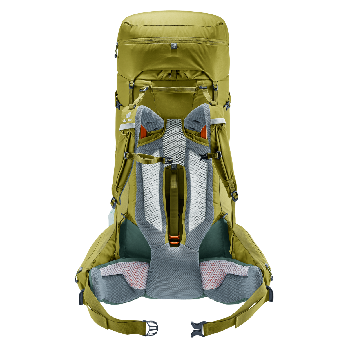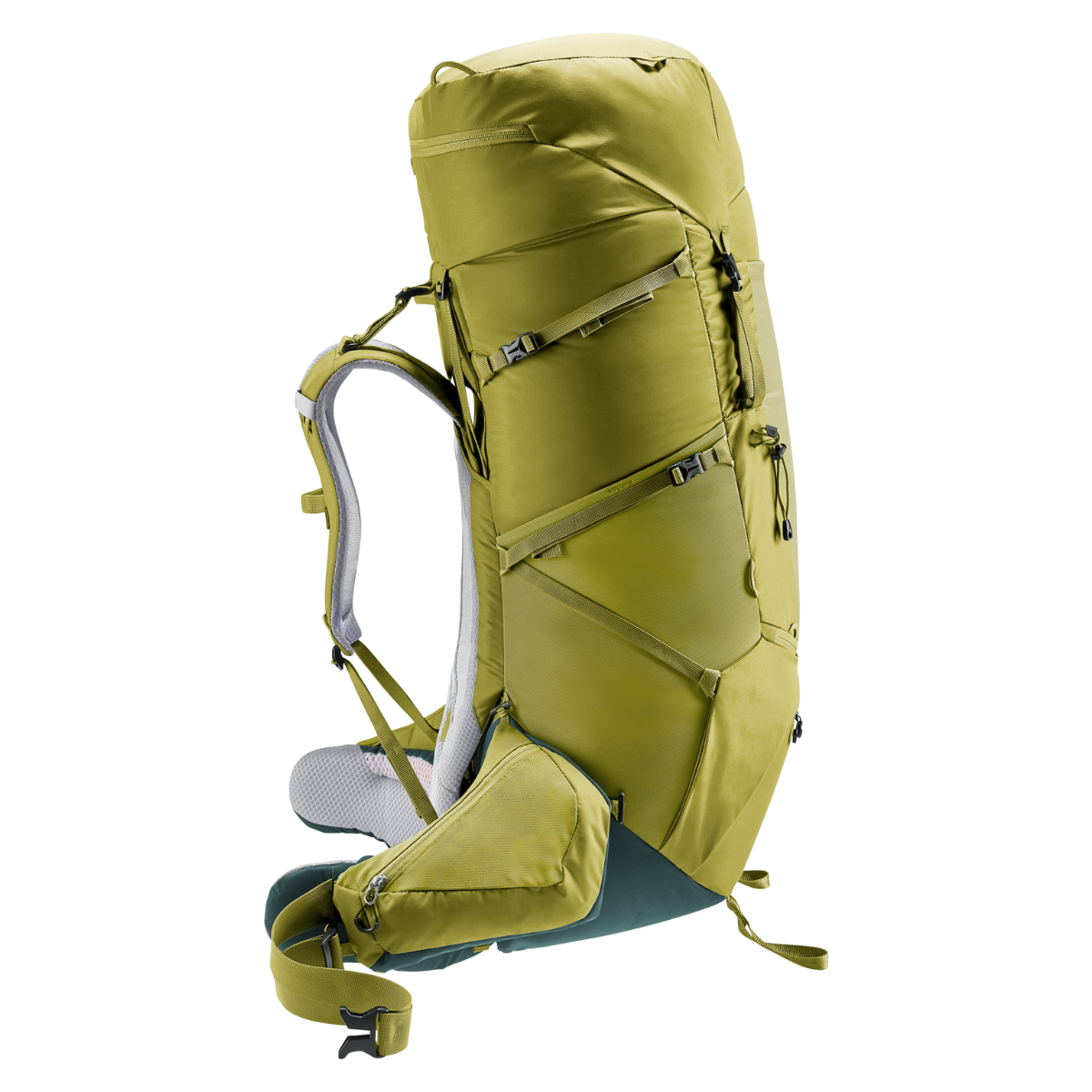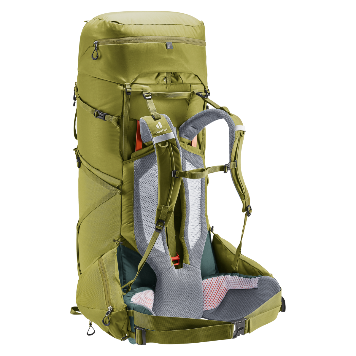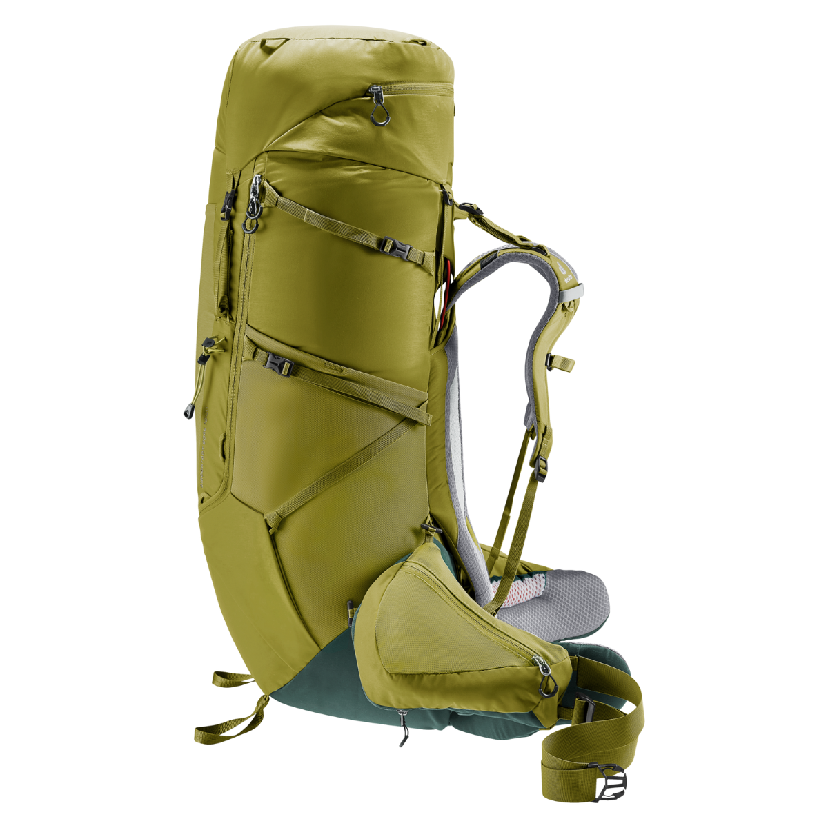 The superior carry comfort and load distribution of this pack is down to the deuter Aircontact back system with Air Spacer mesh and a wide ventilation channel, plus comfortable shoulder straps, mobile hip fins and an ergonomic lumbar pad. A full-length, J-shaped zipper on the front makes it quick and easy to locate items lower down in the main compartment. While detachable 3-liter hip fin pockets provide extra storage and keep items within reach. A zip-out 1.5-liter bottle holster also lets you hydrate on the move.