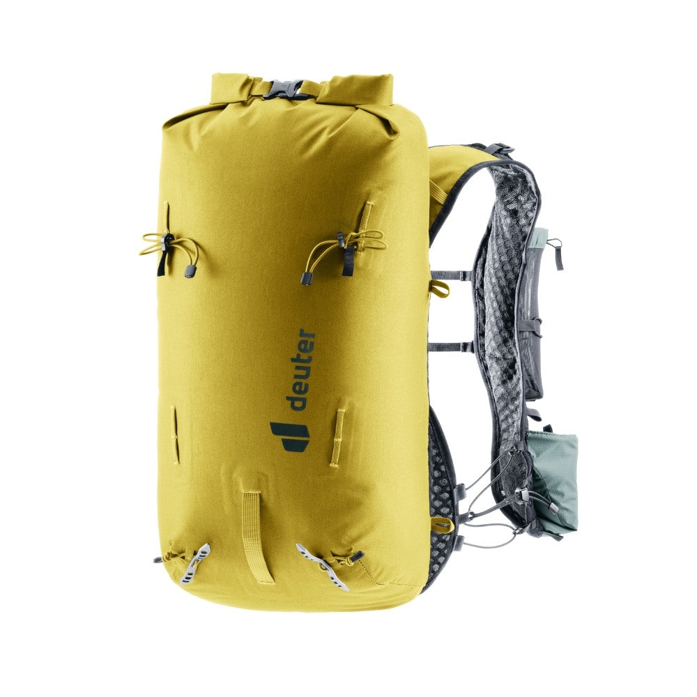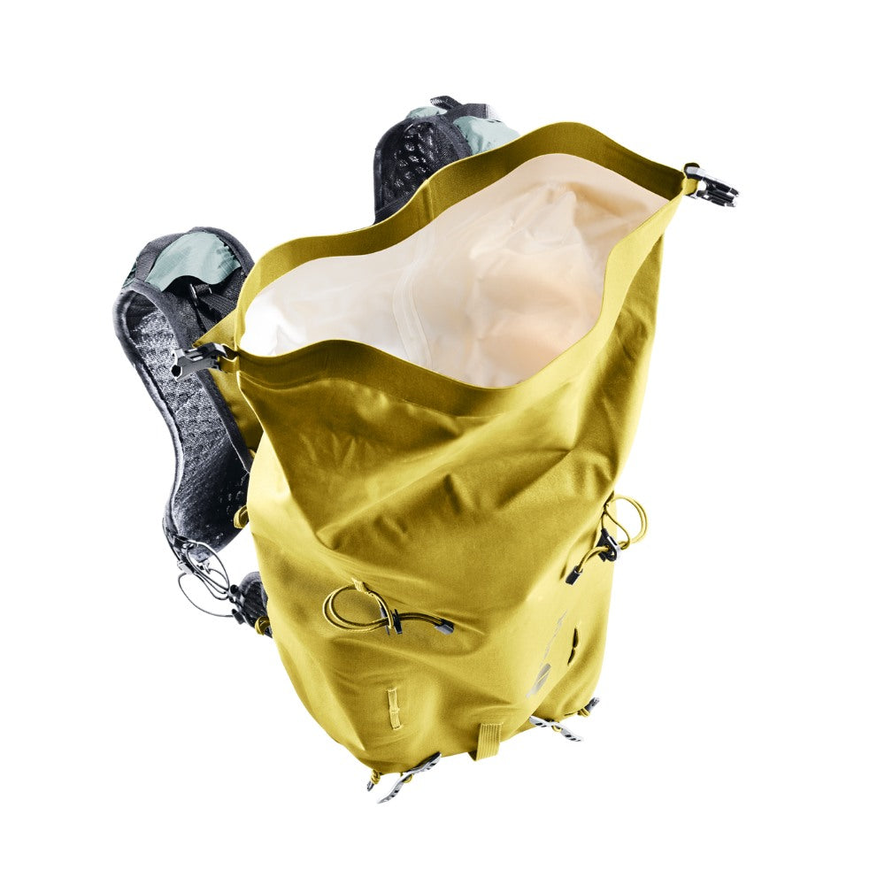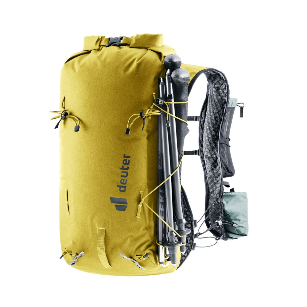 The hard-wearing material, lid construction, taped and welded seams, and TPU-coated zippers combine to protect contents from moisture in this lightweight alpine pack. The wide, vest-style shoulder straps and soft material against the back wrap around the torso to create a seamless fit and unrestricted freedom of movement – when pushing your limits over varied terrain. The vest-style carry system gives on-the-move access to essentials. And a bungee cord means you can switch gear around in no time, too.
