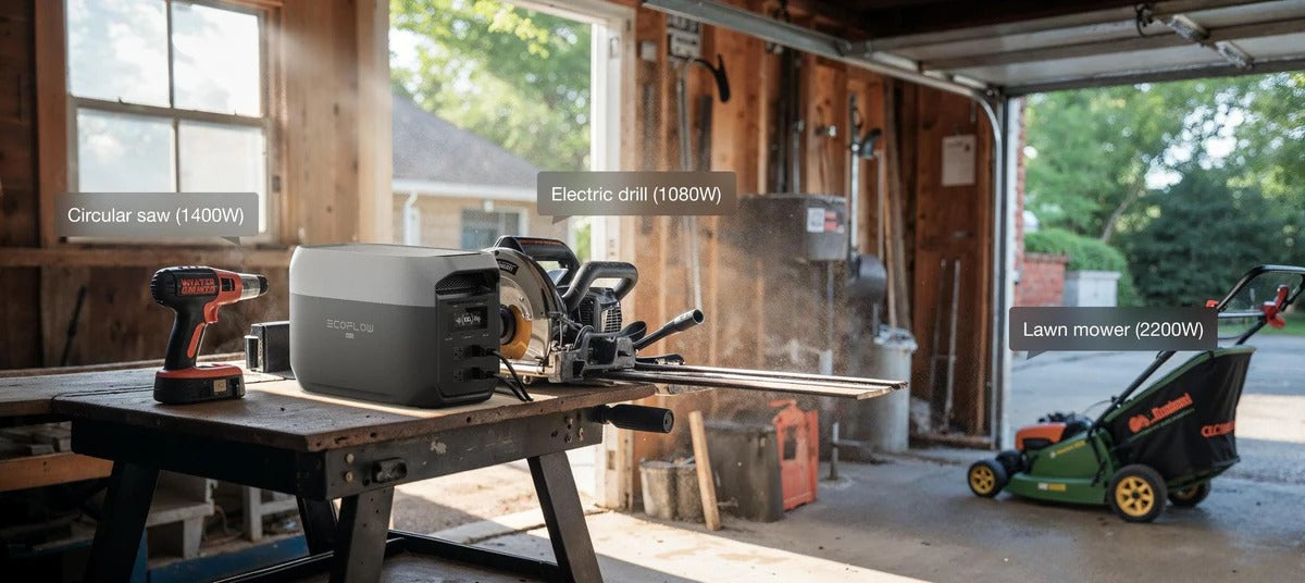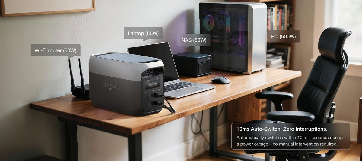 EcoFlow DELTA 3 Max (2048Wh) delivers 2400W AC rated output. With X-Boost™ 3.0 technology, it supports devices up to 3400W—effortlessly taking on your heavy-duty appliances. The inverter samples AC voltage and current every 33μs with high precision using a DSP chip, ensuring pure sine wave output with beyond grid-level stability—ideal for powering sensitive electronics reliably.