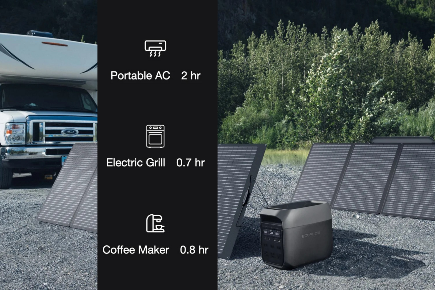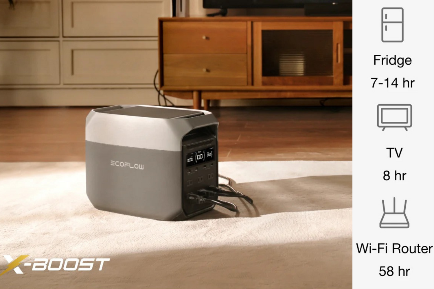 EcoFlow DELTA 3 supports 99% of household devices, including refrigerators, TVs, and computers. Plus, with X-Boost, continuously power appliances over 2200W, such as ovens (2150W), hair dryers (1800-2500W), and kettles (1200-3000W). Perfect for home backup, RV, and outdoor usage, this powerhouse ensures you're never left in the dark.