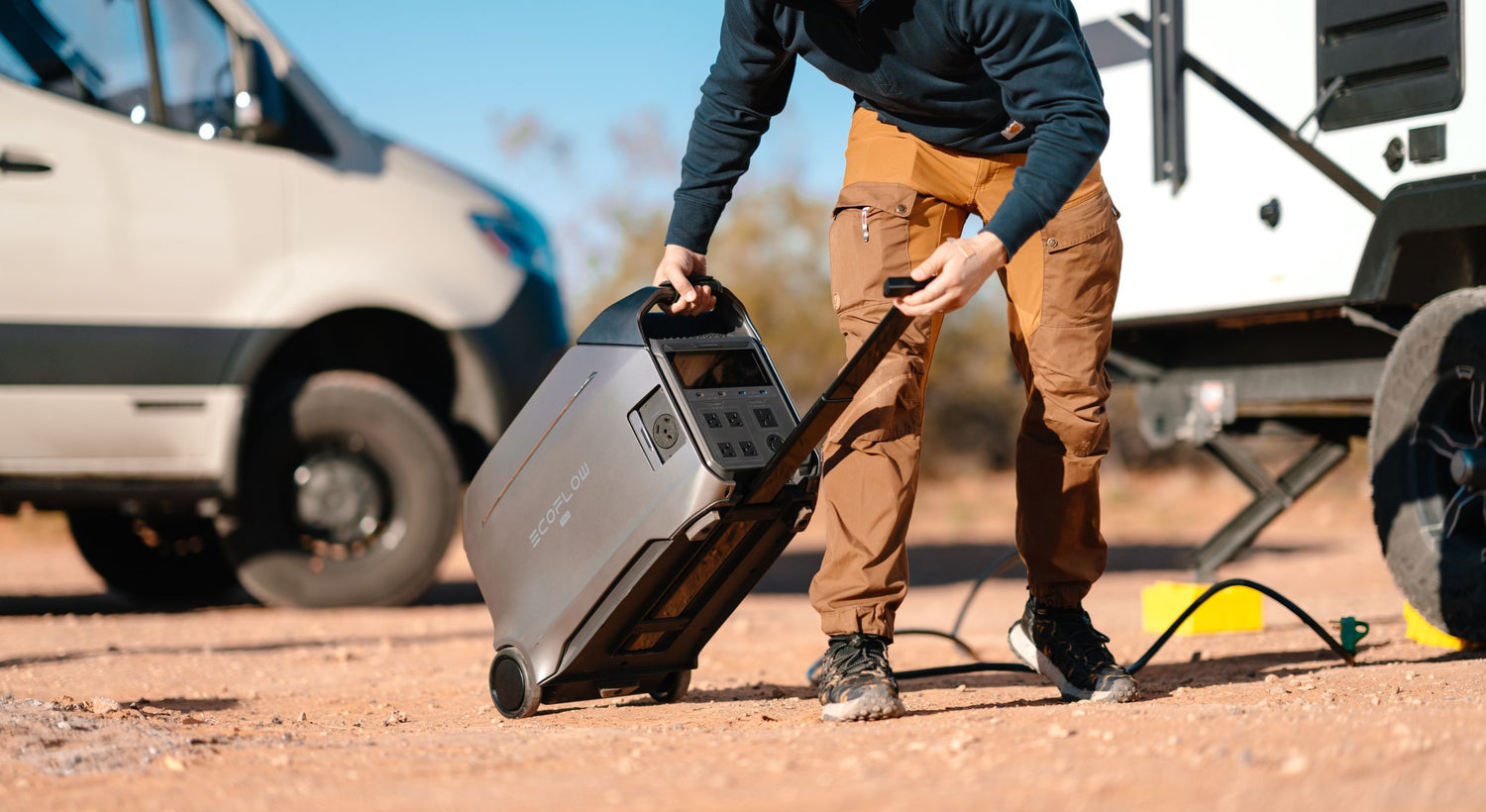 Keep your home on wheels powered wherever your adventure takes you. Power your lights, fridge, and all the other essentials powered with ease. Directly hook up to the Delta Pro 3 using either the 30A / 120V port (3 prong), the 30A 120/240V port (NEMA L14-30R 4 prong), or with the EcoFlow 50A hub (4 prong / sold separately).
