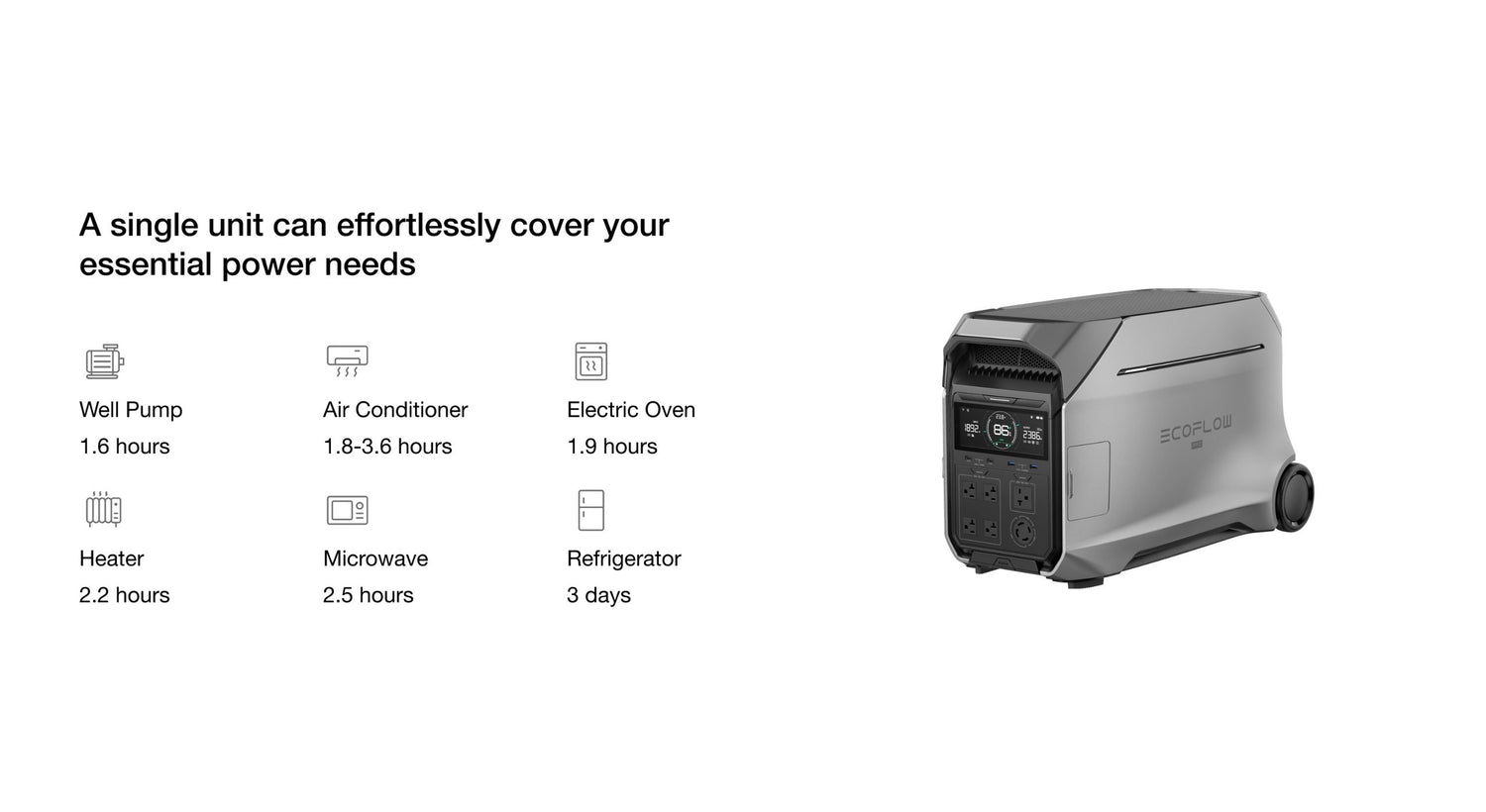 A single source to power almost all of your essential home appliances. Power high-demand appliances from 3 ton central AC to 1 HP water pump—with robust 4000W and dual 120V/240V capabilities. Keep your kitchen buzzing and essential systems like garage doors running, all powered simultaneously and reliably by EcoFlow.