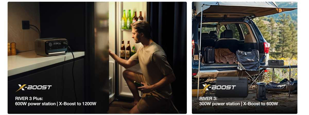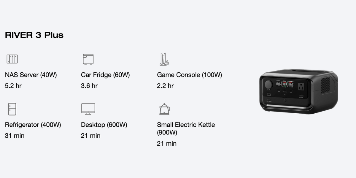 The RIVER 3 Series is a beast in the small power station game, cranking out up to 600W of rated power. With an additional built-in light, you'll never get left in the dark. Its X-Boost technology can continuously handle 1200W heating devices without breaking a sweat, keeping 90% of home appliances running smoothly.