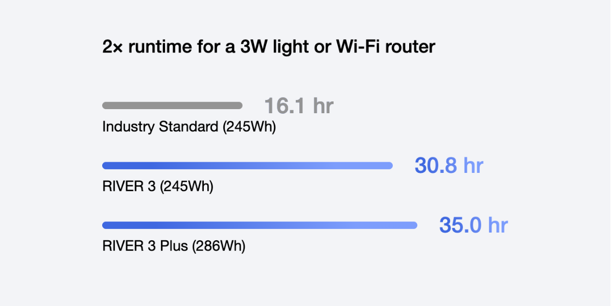 The RIVER 3 Series revolutionizes energy efficiency, delivering up to double runtime for light-wattage appliances, extending use at home and in the great outdoors.