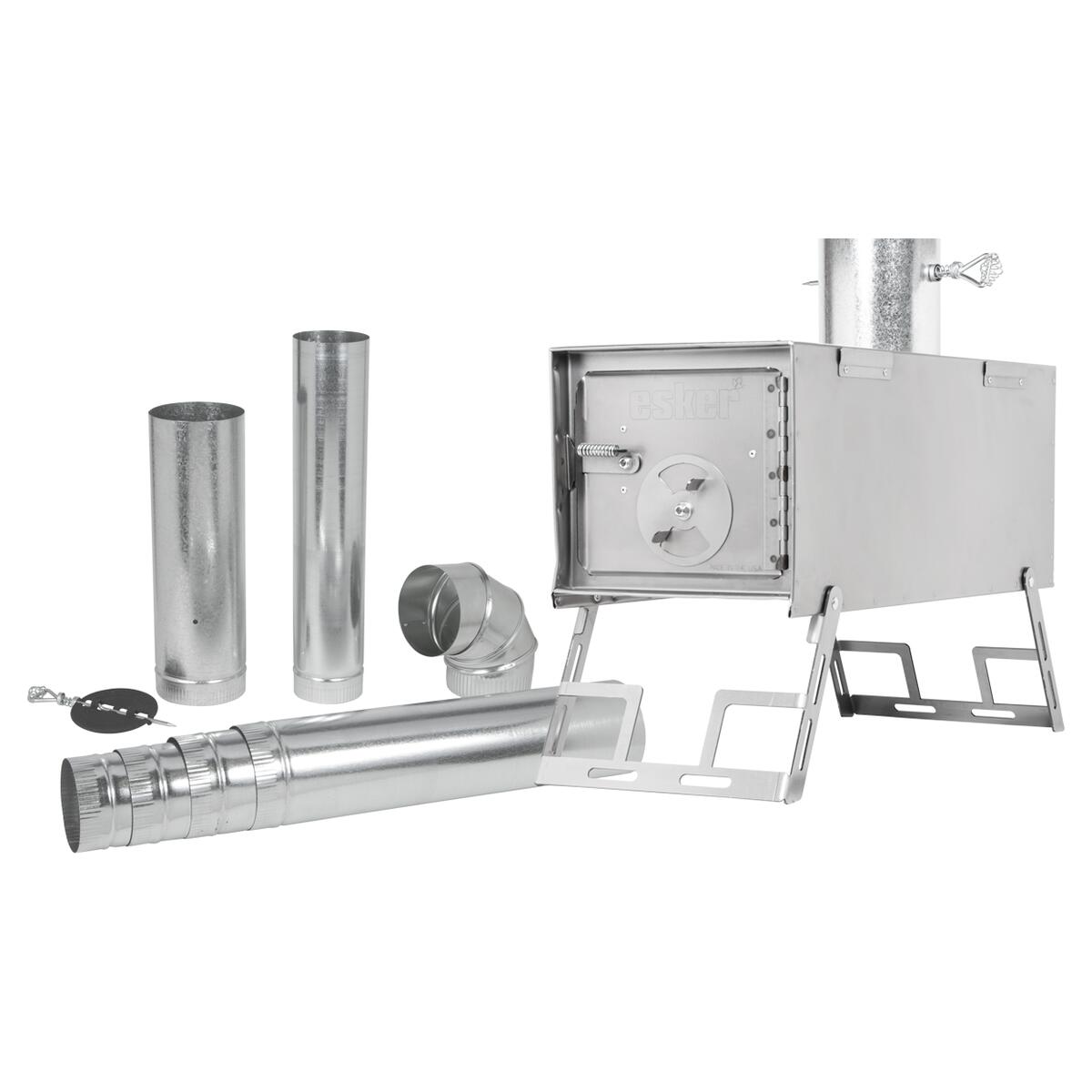 Introducing the Esker Ontario 2 Winter Tent Stove by Kni-Co. Designed for use in tents where an elbow is required for angled pipe stacks, the Esker Ontario 2 stove features nesting galvanized pipes and a stove box on EskerÕs specially designed snow float legs for stabilizing the stove with branches or poles. All stove pipes stow inside the stove box and Esker legs fold up for light and easy transport. The included damper and air intake control on the stove door makes burn rate and temperature regulation a breeze. The 22 gauge cold rolled steel makes for a functional, lightweight yet sturdy stove to help you make the most of your Canadian winter outdoors.