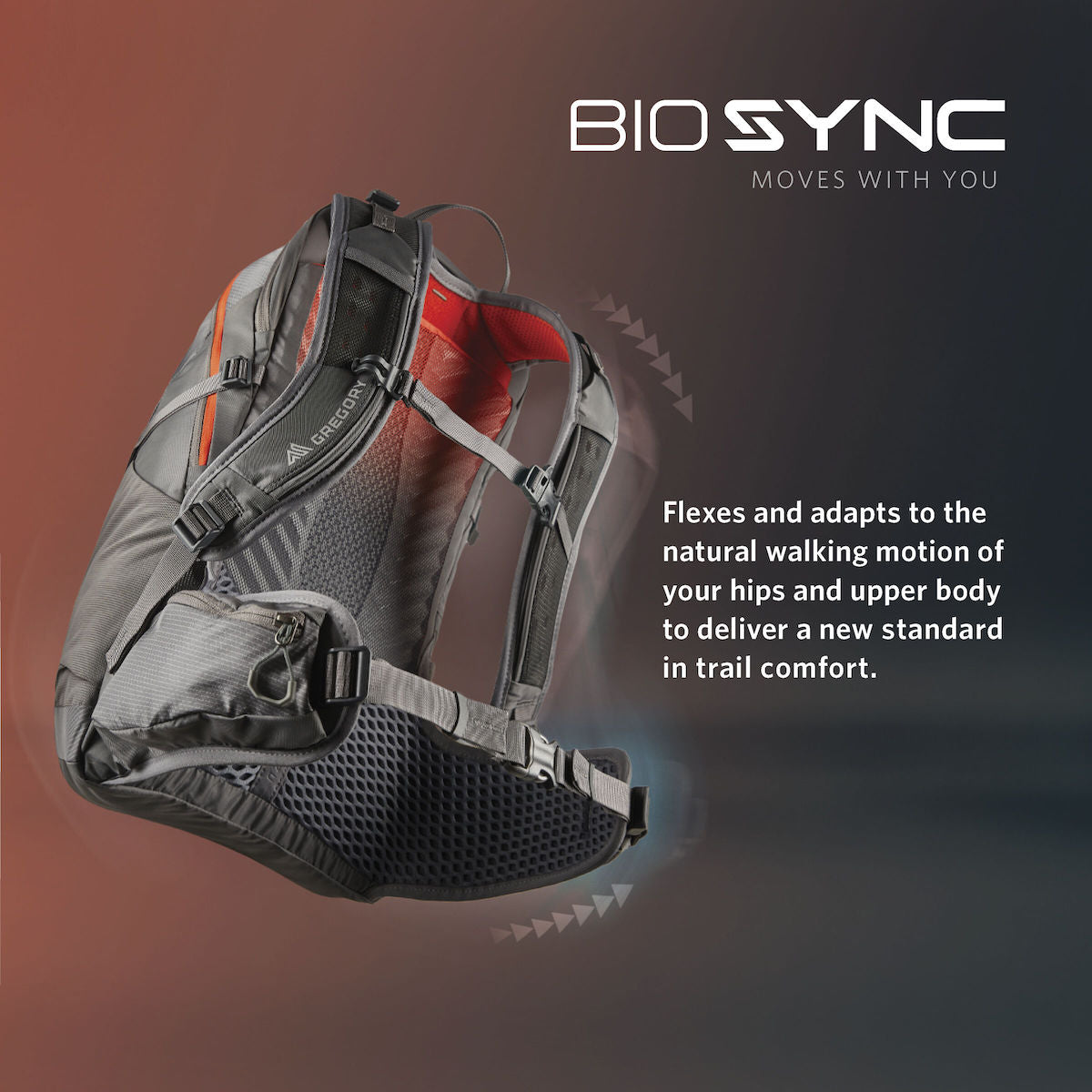 BioSync flexible hipbelt and shoulder harness that stretch and move with the natural motions of your body.