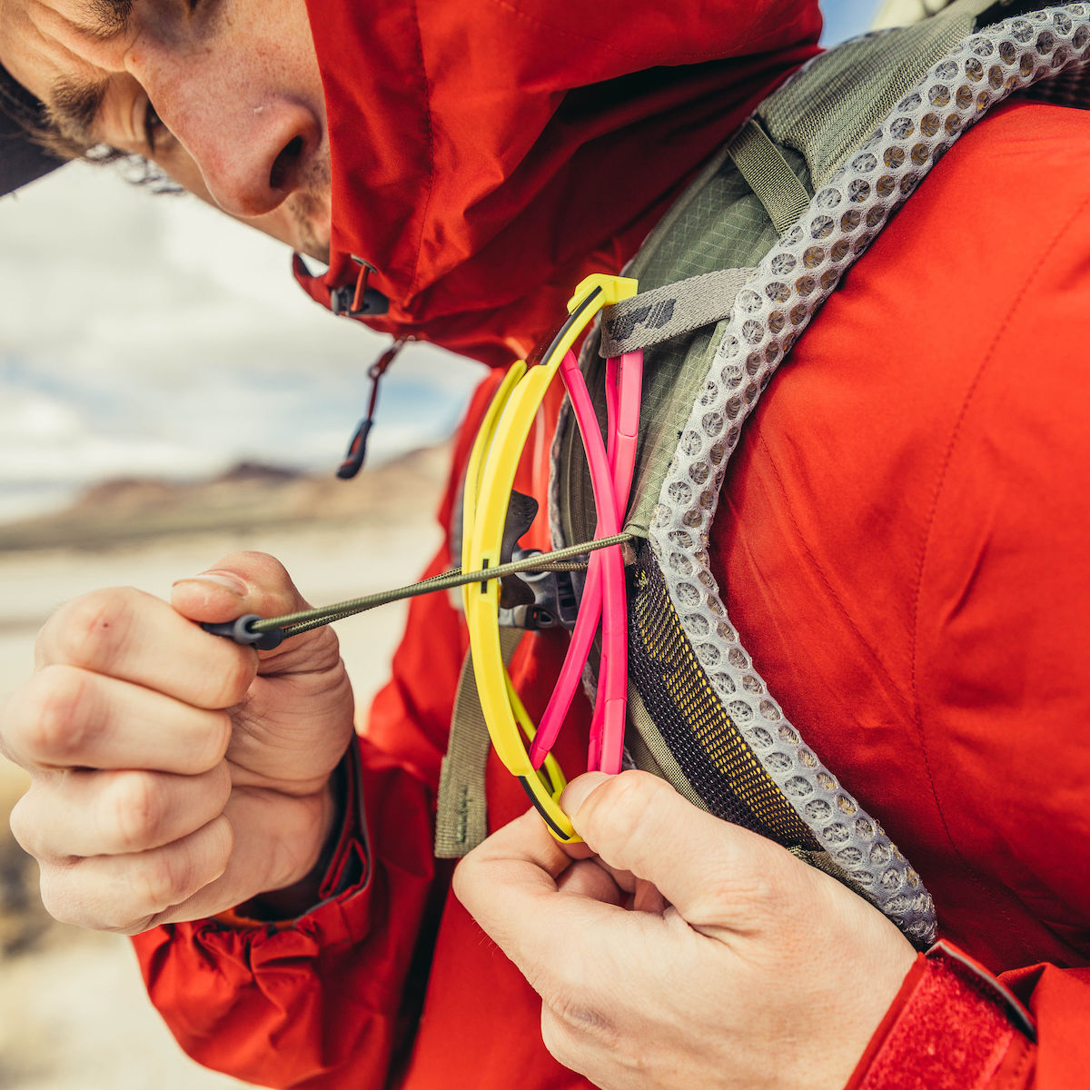 Sunglass QuickStow system on shoulder harness for quick, secure and scratch-free access to your shades.
