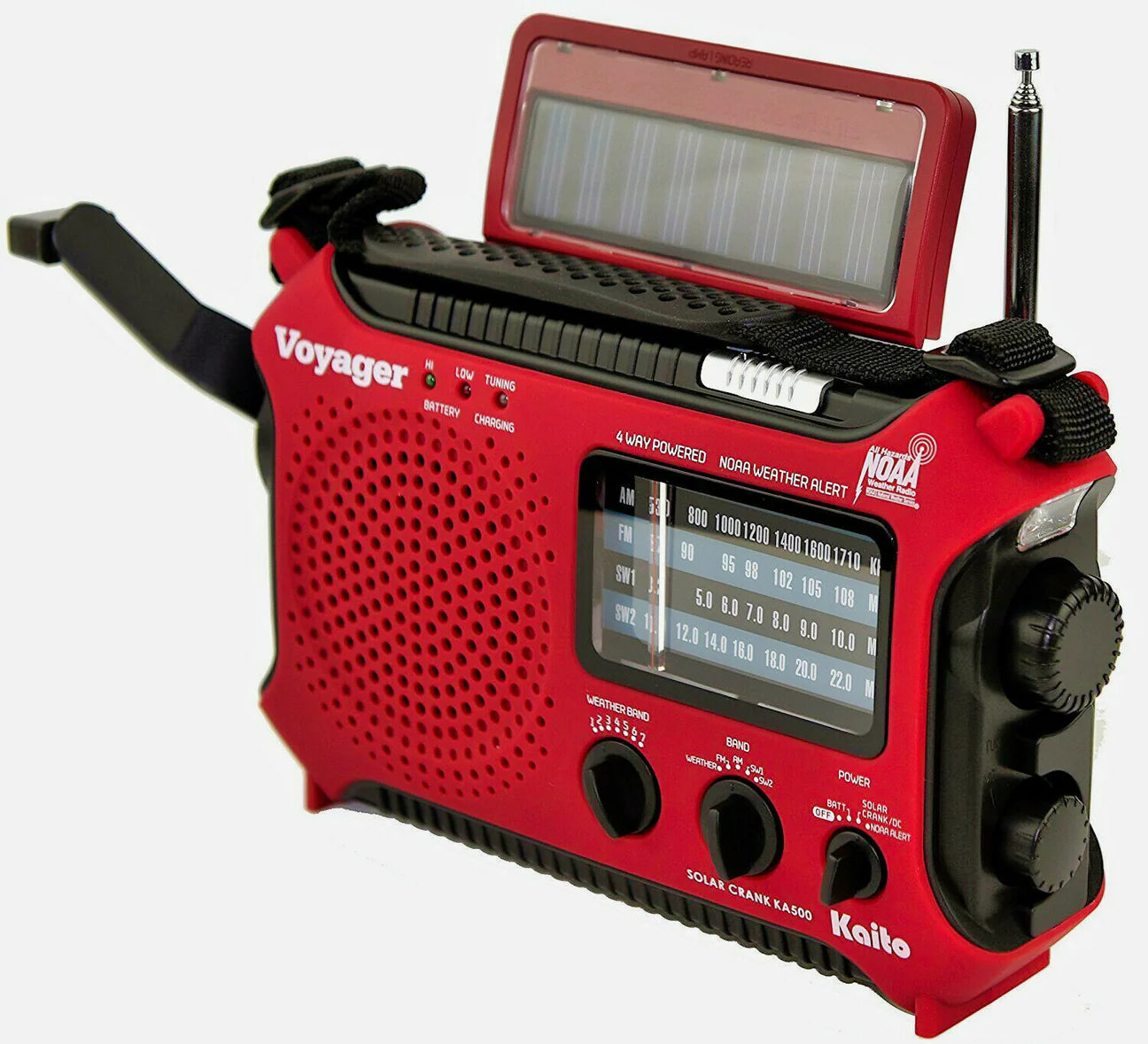 The Kaito KA500 Voyager is a portable receiver designed for both daily use & emergency preparedness applications. As an emergency preparedness tool, it offers different methods to power up including an AC/DC adapter (sold separately), a built-in rechargeable battery that can be charged by the optional AC adapter, hand cranking or a USB power source, and the patented flip-up 180-degree adjustable solar panel provides power for the radio even when no battery is installed.